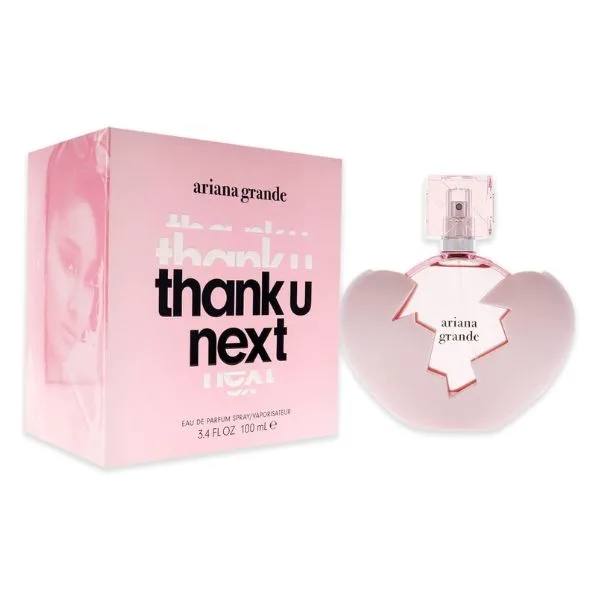 Descripción: ¡El frasco más instagrameable ha llegado! El perfume Thank U, Next de Ariana Grande no solo huele increíble, sino que su diseño de corazón roto es una pieza de colección para cualquier tocador. Su estética rosa "millennial" captura perfectamente la energía de la cultura pop actual. Es el regalo ideal para alguien que ama las fragancias dulces con notas de coco y frambuesa, envueltas en un empaque lleno de actitud.